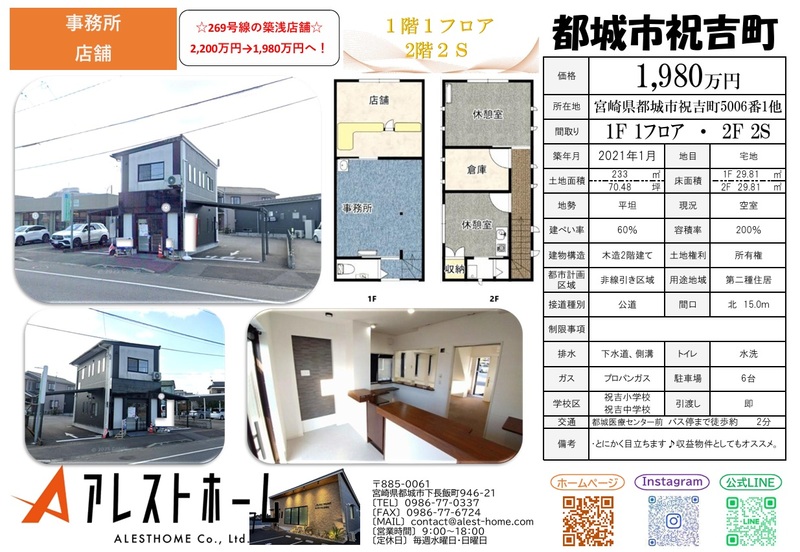 【事務所・店舗】 1980万 祝吉町 ☆県道269号線沿いの目立つ立地♪☆